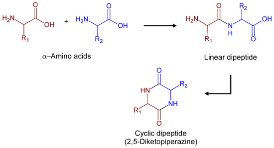 A promising platform for therapeutic exploration are 2,5-Diketopiperazines (2,5-DKPs). Chemically, these compounds are characterized by a six-membered bis lactam ring whose carbon and nitrogen atoms afford four points for chemical modifications that may allow for obtaining a vast range of derivatives. Their rigid cyclic backbone mimics natural peptide conformations in combination with stability against rapid metabolic degradation by proteolysis and makes the DKP core an attractive lead-like scaffold for drug discovery [6]. Natural 2,5-DKPs with wide structural diversity and biological properties are found as secondary metabolites in plants, fungi, bacteria, and marine organisms [7,8]. The most structurally simple natural 2,5-DKPs are biosynthesized through head-to-tail condensations of two α-amino acids [9] followed by intramolecular cyclization of the dipeptides, as illustrated in Figure 1. Many natural 2,5-DKPs have shown a broad spectrum of medicinal activities including anticancer, neuroprotective, antioxidant, and antimicrobial properties [9,10]. Others have also shown promising anti-protozoal activities against leishmaniasis [11,12], CD [13,14], and malaria parasites [15,16].