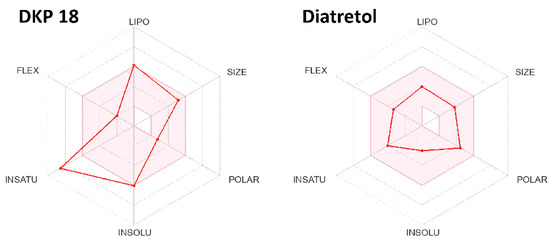 Bioavailability radar examples of the active 2,5-DKPs 18 and Diatretol. The red area represents the optimal range of LIPOphilicity, SIZE, POLARity, INSOLUbility, INSATUration, and FLEXibility for drug-like compounds.