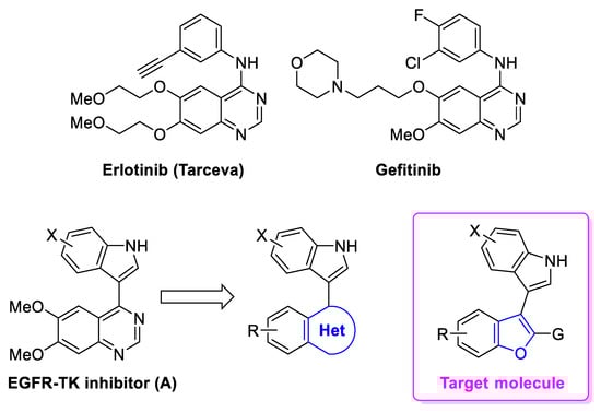 Erlotinib and gefitinib are two representative EGFR-TKIs with a 4-anilinoquinazoline skeleton (Figure 2). In 2008, Lüth and Löwe reported the synthesis of quinazoline–indole hybrids (A) which were found to exhibit EGFR inhibitory activity [14]. In connection with our continued interest in the design and synthesis of new anticancer agents [15,16], we hoped to find a new heterocyclic skeleton to replace the quinazoline moiety while retaining the indole group. Along this line, we wondered whether benzofuran could be used instead of quinazoline.