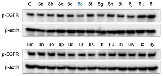 The inhibitory effects of 8a–y on the EGFR in PC9 cells. PC9 cells were pretreated with 10 μM of 8a–y for 6 h, and then the cells were treated with EGF (20 ng/mL) for 30 min. The expression levels of p-EGFR were observed by immunoblot analysis.