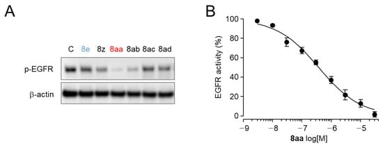 The inhibitory effects of 8e and 8z–ad on the phosphorylation of EGFR in PC9 cells. (A) PC9 cells were pretreated with 10 μM of 8e and 8z–ad for 6 h, and then the cells were treated with EGF (20 ng/mL) for 30 min. The expression levels of p-EGFR were observed by immunoblot analysis. (B) The kinase inhibitory activity of 8aa on the EGFR was assessed using an EGFR kinase assay kit.