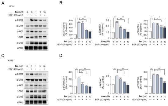 The inhibitory effects of 8aa on the EGFR signaling pathways in PC9 and A549 cells. (A,C) PC9 and A549 cells were pretreated with 8aa at the indicated concentrations for 6 h, and then the cells were incubated with EGF (20 ng/mL) for 30 min. The expression levels of p-EGFR, t-EGFR, p-AKT, t-AKT, p-ERK1/2, and t-ERK1/2 were measured by immunoblotting. (B,D) p-EGFR, p-AKT, and p-ERK1/2 protein intensities were normalized to t-EGFR, t-AKT, and t-ERK1/2, respectively (mean ± S.E., n = 3). * p < 0.05; ** p < 0.01.