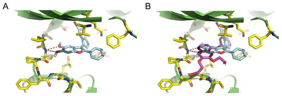 Binding mode of 8aa with the EGFR. (A) A structural simulation of the 8aa-EGFR complex showed that some residues (yellow stick) were involved in binding with 8aa (cyan—carbon), including non-bonded interactions (Phe723, Val726, Met677, and Leu844) and red dot hydrogen bonds (Met793). (B) A super-imposed model of the co-crystal structure (1M17.pdb) of 8aa and erlotinib (magenta—carbon).