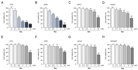 Effects of 8aa on cell viability in PC9, A549, MCF7, HepG2, PC3, HT29, HaCaT, and HEK293T cells. (A–H) PC9, A549, MCF7, HepG2, PC3, HT29, HaCaT, and HEK293T cells were treated with 8aa at the indicated concentrations for 72 h, and the medium was changed every 24 h with newly added 8aa. Cell viability was estimated with the MTS assay (mean ± S.D., n = 6). * p < 0.05; ** p < 0.01; *** p < 0.001.