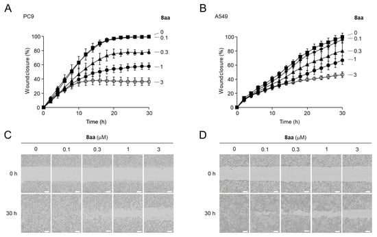 Effect of 8aa on cell migration in PC9 and A549 cells. (A,B) An in vitro wound healing assay was performed on PC9 and A549 cells for 30 h (mean ± S.D., n = 3). The PC9 and A549 cells were treated with the indicated concentrations of 8aa, and time-lapse images were obtained every 2 h after wound infliction. (C,D) Representative wound images were taken at 0 h and 30 h following the administration of 8aa at the indicated concentrations. The scale bars represent 300 μm.