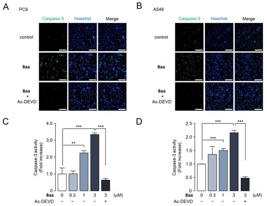 PC9 and A549 cells were grown in 96-black well plates to approximately 50% confluence, and then the cells were incubated with 8aa for 24 h. To measure caspase-3 activity, the growth medium was replaced with 100 μL of PBS containing 1 μM of caspase-3 substrate and NucView 488 and incubated at room temperature for 30 min. Then, the cells were stained with 1 μM of Hoechst 33342. Caspase-3 activity was completely inhibited by Ac-DEVD-CHO, a potent caspase-3 inhibitor. The FLUOstar Omega microplate reader (BMG Labtech, Ortenberg, Germany) was used to measure the fluorescence of Hoechst 33342 and NucView 488, and a Lionheart FX Automated Microscope (BioTek, Winooski, VT, USA) was used to obtain the fluorescence microscopy images.