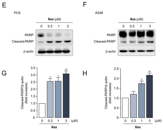 Effects of 8aa on caspase-3 activity and PARP cleavage in PC9 and A549 cells. (A,B) PC9 and A549 cells were treated with 3 µM of 8aa for 24 h and then incubated with 1 µM of caspase-3 substrate (green) and 1 µM of Hoechst 33342 (blue) for 30 min before image acquisition. The scale bars represent 200 μm. (C,D) The PC9 and A549 cells were treated with 8aa at the indicated concentrations for 24 h, and then 1 μM of caspase-3 substrate was treated for 30 min. Caspase-3 activity was inhibited by 20 μM of Ac-DEVD-CHO (mean ± S.D., n = 3). (E,F) The cells were treated with 8aa at the indicated concentrations for 24 h, and the expression levels of PARP, cleaved-PARP, and β-actin were measured by immunoblotting. (G,H) Cleaved-PARP protein intensities were normalized to β-actin (mean ± S.E., n = 3). * p < 0.05; ** p < 0.01; *** p < 0.001.