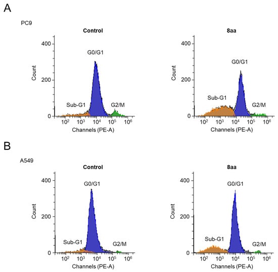 To further investigate the effect of 8aa on the cell cycles of PC9 and A549 cells, we carried out cell cycle analysis using propidium (PI) staining. As shown in Figure 11, 8aa significantly promoted the ratios in the Sub-G1 (apoptotic peak) phase compared to the control group, but the G2/M phase was not affected by 8aa. In the case of the 8aa treatment group, the G0/G1 phase reduced from 73.01% to 47.50% and from 81.64% to 64.24% in the PC9 and A549 cells, respectively. Also, the Sub-G1 phase increased from 8.52% to 35.23% and from 8.48% to 21.40% in the PC9 and A549 cells, respectively. These results suggest that 8aa significantly induces apoptosis without exerting an effect on cell cycle arrest.