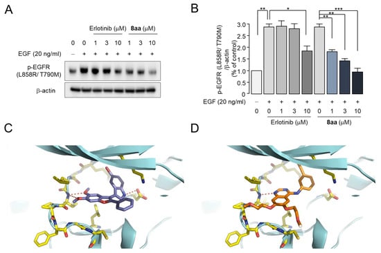 Effect of erlotinib and 8aa on EGFRL858R/T790M. (A) H1975 cells were pretreated with erlotinib and 8aa at the indicated concentrations for 6 h, and then EGF (20 ng/mL) was treated for 30 min. (B) p-EGFR (L858R/T790M) band intensities were normalized to β-actin (mean ± S.E., n = 3). (C) A structural simulation of the 8aa complex showed that some residues (yellow stick) were involved in binding with 8aa (purple—carbon) red dot hydrogen bonds (Met793 and Asp855). (D) A docking model of erlotinib (orange—carbon) established by using the co-crystal structures of EGFRL858R/T790M (4I22.pdb). * p < 0.05; ** p < 0.01; *** p < 0.001.