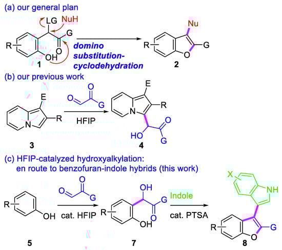 As part of our general plan to make poly-functionalized benzofurans, a domino nucleophilic substitution–dehydrative cyclization procedure with 1 was deemed to give 2,3-disubstituted benzofuran 2 (Scheme 1a). To validate our hypothesis, the requisite starting material 1 (when LG is OH) was envisioned to be easily prepared via a Friedel–Crafts-type reaction between phenol and arylglyoxal [24]. Inspired by our recent success in achieving the hexafluoroisopropanol (HFIP)-mediated hydroxyalkylation of indolizine 3 to arylglyoxal to afford 4 (Scheme 1b) [25], we expected that a HFIP-promoted Friedel–Crafts-type reaction between phenol 5 and arylglyoxal would give rise to 7, which could be converted to benzofuran 8, having an indole at the C3 position upon exposure to indole and p-toluenesulfonic acid (PTSA) (Scheme 1c). The biological investigation of benzofuran–indole hybrid 8 [26] revealed that this class of compounds exhibit anticancer activity against PC9 and A549 lung cancer cells via the inhibition of phosphorylated EGFR. Here, we wish to describe our findings along this line.