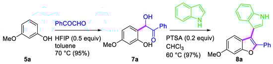 When we reacted 5a (2 equiv) with phenylglyoxal (1 equiv) in the presence of HFIP (0.5 equiv) in toluene at 70 °C, the desired product 7a was isolated in 95% yield (Scheme 2). The subsequent treatment of 7a with indole and PTSA (0.2 equiv) in CHCl3 at 60 °C provided benzofuran possessing an indole at the C3 site in 97% yield.