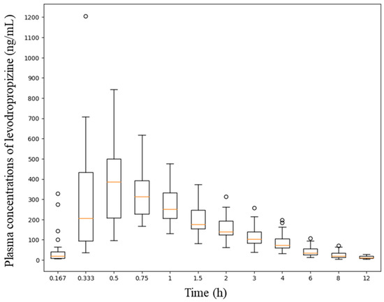 Plasma concentration profiles (depicted as a boxplot) following single oral exposure to levodropropizine (60 mg tablet) in 40 healthy Korean men. The X- and Y-axes in the graph represent time and plasma concentration values according to levodropropizine exposure, respectively.