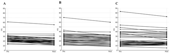 Spaghetti plot of changes in aspartate transaminase (A), alanine transaminase (B), and gamma-glutamyl transpeptidase (C) levels before (0 h) and after (12 h after dose) single oral exposure to levodropropizine. Pre and Post on the X-axis in the figure refer to 0 and 12 h after oral exposure to levodropropizine, respectively.