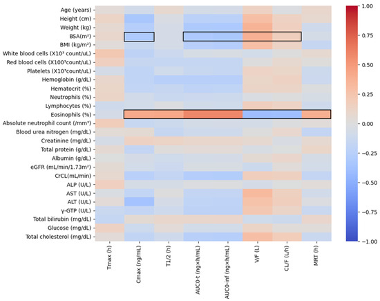 The results of heatmap analysis performed by screening for correlations between pharmacokinetic parameter values obtained through non-compartmental analysis and physiochemical parameters are presented in Figure 3. Eosinophil levels and BSA were explored as physiochemical factors with valid correlations (correlation coefficient is greater than +0.3 or less than −0.3) with pharmacokinetic parameters. On the other hand, other physiochemical factors were not valid for screening correlation with pharmacokinetic parameters. In particular, no significant correlations with pharmacokinetic parameters were identified for eGFR, creatinine, and CrCL, which are used as indicators of renal function, and ALP, AST, ALT, and γ-GTP, which are generally used as indicators of liver function.
