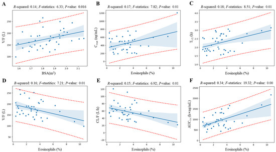 Linear regression analysis results for elements whose coefficient values are at the top of the valid correlation derived from the heatmap screening results. Blue dots, blue thick solid lines, and blue shading in the graph represent observations, the average line by the regression model, and the 95% confidence interval, respectively. The red dotted lines in the graph represent the 95% prediction interval. Correlations are shown for BSA–volume of distribution (V/F) (A), eosinophil level–maximum plasma concentration (Cmax) (B), eosinophil level–elimination half-life (T1/2) (C), eosinophil level–V/F (D), eosinophil level–clearance (CL/F) (E), and eosinophil level–area under the curve from 0 to observed time after administration (AUC0-t) (F), respectively.