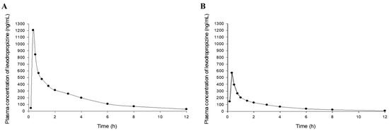 Graphic comparison of levodropropizine pharmacokinetic profiles (following single oral exposure to levodropropizine 60 mg tablet) between subjects with the highest (10.6%, (A)) and lowest (0.4%, (B)) eosinophil levels in this clinical study’s population.