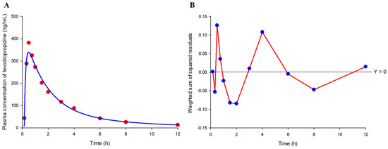 Model fitting results for observed mean plasma concentration values (A) and weighted sum of squared residual (WSSR) distribution patterns (B). The X-axis of the graph represents time after single exposure to levodropropizine 60 mg tablet. Red dots and solid blue line in the model fitting graph (A) represent observations and model predictions, respectively. The blue dots and solid red lines in the WSSR distribution pattern graph (B) represent WSSR values at each time point and the run results (based on 0) according to the connection of all points, respectively.