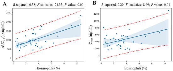 Linear regression analysis results between eosinophil levels and pharmacokinetic parameters (area under the curve from 0 to observed time after administration (AUC0-t) (A) and maximum plasma concentration (Cmax) (B)) derived from the basic structure of the explored compartment model (two-compartment model with a lag time). Blue dots, thick solid blue lines, and blue shading in the graph represent observations, the average line obtained in the regression model, and the 95% confidence interval, respectively. The red dotted lines in the graph represent the 95% prediction interval.