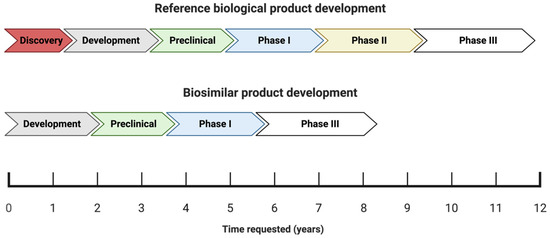 Schematic illustration of the development phases and the timeline (in years) of reference biologics versus biosimilars.