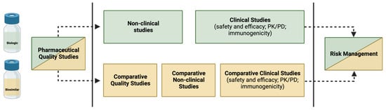 To establish biosimilarity, it is essential to evaluate whether the quality attributes (QAs) of a biosimilar and the RP are comparable. QAs are measurable product characteristics that describe the main properties of a drug molecule. Unlike generics, biologicals are molecules with intrinsic variability, which makes their QAs heterogeneous and susceptible to changes throughout the manufacturing process. It is important to conduct a comprehensive analysis of any differences that exist, to ensure that these are not clinically [23] relevant to the point of compromising the product’s function, immunogenicity, and efficacy. Therefore, unlike a generic, a biosimilar must present clinical and non-clinical data that prove its similarity, i.e., comparability studies must be carried out (this topic will be discussed in depth in Section 3) [17,20].