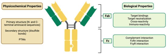 Characterization of a biosimilar mAb, evidencing its physicochemical and biological properties. Fab: fragment antigen binding; Fc: fragment crystallizable; FcRn: neonatal Fc receptor; FcγR: Fc-gamma receptor.