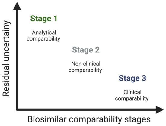 Clinical studies constitute the third stage of the comparability study [49]. As mentioned, the establishment of biosimilarity focuses, above all, on preclinical aspects and, particularly, on the quality of the biosimilar. Thus, the number and scope of clinical studies executed rely on the level of uncertainty regarding biosimilarity, determined by previous analytical assessments (and non-clinical in vivo testing, if executed)—see Figure 4 [12,21].