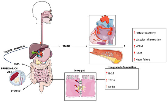 Gut-microbiota derived metabolites involved in cardiovascular disease. High protein intake leads to an increased production of TMA and p-cresol that negatively impacts gut permeability leading to systemic low-grade inflammation. IL-1beta (Interleukin-1 beta), ICAM (Intercellular Adhesion Molecule 1), NF-kB (Nuclear factor kappa B), TMA (Trimethylamine), TMAO (Trimethylamine N-Oxide), TNF-alpha (Tumor necrosis factor alpha), VCAM (Vascular cell adhesion protein). ↑ denotes increase.