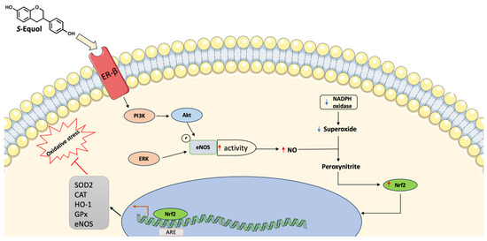 Indeed, it was observed that equol has higher antioxidant activity compared to isoflavones [97,98,99] and higher bioavailability because of its reduced propensity to bind serum proteins [100]. Furthermore, equol shows an increased affinity for ER-beta compared to daidzein [101] and it is more lipophilic than isoflavones, resulting in a greater bioavailability [102]. Different studies have investigated the beneficial effects of equol on health, even if results from human studies are more inconsistent because of the great variability that distinguishes individuals in equol-producers and equol-non producers [103,104,105]. Oxidative stress and inflammation are the pivotal causes of an increased risk of developing CVD [26,27]. Increased accumulation of oxidized lipids leads to atherosclerosis through the activation of proinflammatory pathways and the increase of proinflammatory cytokines such as interleukin- (IL) 1beta, tumor necrosis factor-alpha (TNF-alpha), and nuclear factor-kB (NF-kB) [26]. Proinflammatory cytokines induce the expression of vascular cell adhesion molecule-1 (VCAM-1) by endothelial cells (ECs) increasing the adhesion of leukocytes, monocytes, and T lymphocytes to the arterial wall [106,107]. Once adhered to the endothelium, monocytes enter the vessel wall and initiate the production of monocyte chemoattractant protein-1 (MCP-1) [106] and become the mature form macrophages and begin to accumulate cholesterol into the cytoplasm transforming into foam cells [108]. Several in vivo and in vitro studies reported the anti-inflammatory effects of equol which showed the ability to reduce the expression of inflammatory biomarkers, such as prostaglandin E2 [109] and MCP-1 [110] as well as the reduction of IL-6 release and its receptor [111]. Myeloperoxidase (MPO) and nicotinamide adenine dinucleotide phosphate (NADPH) oxidase are enzymatic sources of reactive oxygen species (ROS) that lead to the production of oxidized LDL (oxLDL) [112,113]. Equol protects from oxidative stress by reducing the lipid peroxidation product malondialdehyde (MDA), enhancing the antioxidant glutathione, or increasing the activities of the enzyme superoxide dismutase (SOD) [114,115] and increasing the expression of nuclear factor erythroid 2 (Nrf2) [116]. Equol also showed the ability to reduce the NADPH-induced superoxide production [97] and to increase the expression of phosphorylated-p38 mitogen-activated protein kinase and Bcl-2 [117]. Oxidative stress and inflammation cause damage to the endothelium and alter its functions. It was observed that equol can stimulate the phosphorylation of phosphatidylinositol 3-kinase/protein kinase B (PI3K/Akt) and enhance the activity of endothelial NO synthase (eNOS) through the binding to the ER-beta receptor [118,119]. Equol can activate eNOS also via ER-independent pathways through the activation of extracellular signal-regulated kinase (ERK) 1/2 and Akt [119]. Furthermore, equol can directly upregulate eNOS transcription [120,121] while eNOS gene contains an estrogen-response element, it is reasonable that the binding of equol to ER-beta can enhance eNOS expression [122]. The NO can react with the superoxide anion producing peroxynitrite and enhancing the nuclear accumulation of Nrf2, which in turn binds the antioxidant response elements (ARE) and increases the expression of antioxidant enzymes such as superoxide dismutase, catalase, glutathione-S-transferase, glutathione peroxidase, and heme oxygenase-1 [123].