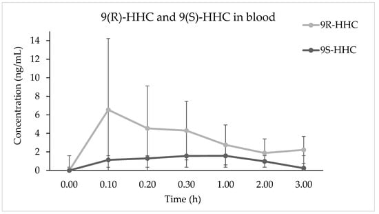Time course of 9(R)-HHC and 9(S)-HHC median concentrations (n = 6, median values ± standard error) in blood following the smoking of 25 mg of a mixture of 9(R)-HHC:9(S)-HHC 50:50 w/w in 500 mg tobacco.