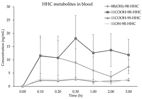 The metabolites detected in the blood samples were 8(R)OH-9(R) HHC, 11OH-9(R)-HHC, 11nor-9(R) COOH HHC and 11nor-9(S) COOH HHC, present as glucuronic acid conjugates. The metabolites’ median (n = 6, ± SD) concentrations in blood up to 3 h after the administration are presented in Figure 3. Notably, only the carboxy metabolites were both in R and S configurations, with the concentration of 11nor-9(R) COOH HHC Cmax 7-fold higher than that of 11nor-9(S) COOH HHC (Table 1). Furthermore, 11nor-9(R) COOH HHC was the most prevalent metabolite at every time point, with a later peak time (1.2 ± 1.35 h) and a higher bioavailability (AUC0–3h 43.7 ± 48.2). Its metabolic precursor 11OH-9(R)-HHC was detected in low concentrations at every time point, with very slow elimination due to its Ke = 0.01 (±0.4, SD). The main hydroxylated metabolite was 8(R)OH-9(R)-HHC. It shows a high Cmax and a rapid onset (Table 1). However, it is rapidly eliminated with a half-life of 1.5 h.