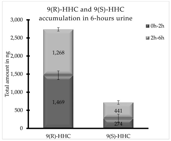Considering both the time ranges, the main metabolite was 8(R)OH-9(R) HHC, with a total accumulation of 60,599 ng, with a comparable elimination between 0 and 2 h and 2 and 6 h. In comparison, the 8(S)OH-9(S) HHC epimer was represented by a negligible quantity (total accumulation 1512 ng), and was prevalently eliminated between 2 and 6 h. Finally, the total accumulation of 11OH-9(R)-HHC in urine amounted to 9618 ng (Figure 5).