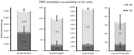 Differently from the other investigated matrices, the metabolites detected were 8(R)OH-9(R) HHC, 8(S)OH-9(S)-HHC, 11OH-9(R)-HHC and 11nor-9(R) COOH HHC, excreted as conjugated metabolites. Indeed, 11nor-COOH-9(S)-HHC was not detected in any sample (Figure 1). Interestingly, all the metabolites were excreted in different amounts between the considered time ranges, with a considerable accumulation between 2 and 6 h (Figure 6). Furthermore, the carboxy metabolite was the least accumulated metabolite in both the time ranges, with a total accumulation of 334 ng in 6 h.