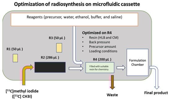 Currently, PET radiotracers are produced in centralized, advanced nuclear medicine laboratories and then distributed to nearby clinics. However, many clinics have limited access to radiotracers to meet the immediate needs of their patients, and some specialized tracers may not be accessible due to the short half-life of radionuclides (Carbon-11; 20.34 min) [6,7]. The need for advanced, automated, and efficient radiotracer production has driven the development of innovative microfluidic techniques, offering promising solutions to overcome the existing challenges and fill the gap [8]. Microfluidic techniques offer significant advantages by enabling real-time and patient-specific radiotracer production such as the dose-on-demand approach [9]. Optimizing precursor quantities and establishing automated microfluidic synthesis protocols using the microfluidic cassette are crucial steps toward realizing the full potential of these batch-type microfluidic techniques to assess their suitability for dose-on-demand production.