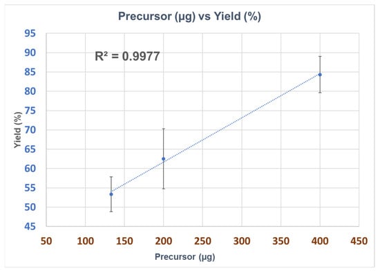 A Further reduction in the precursor amount was performed to investigate the RCY, and the reaction time was maintained at 3 min. The details of the amounts of precursor used with their respective RCYs are summarized in Table 3. When the precursor amount was decreased from 400 µg to 200 µg, the yield gradually decreased from 83 ± 3% (n = 5) to 63 ± 6% (n = 2). When the precursor amount was further reduced to 133 µg, the RCY decreased to 54 ± 4% (n = 2). These results indicate that lowering the amount of precursor leads to a decrease in the precursor concentration for the reaction, reducing the overall RCY. An illustration of the decline in the RCYs corresponding to variations in the precursor quantity is shown in Figure 2. The yield decreased linearly when the precursor quantity was decreased from 400 µg to 133 µg. Notably, the precursor concentration was maintained by reducing the precursor volume, because a decreased precursor concentration correlated with lower RCYs. When 133 µg of precursor was used in 100 µL and 200 µL volumes, the RCYs were 54 ± 4% and 34 ± 15%, respectively. The main reason for the lowered yield was the reduction in the precursor’s concentration, resulting in a poor coating of the precursor on the resin within R4. It is important to maintain the homogeneity of the precursor in R4 to achieve consistent RCYs. Finally, the precursor amount was optimized to 400 µg with a 300 µL volume, and validation runs were performed using the same amount of precursor and the same volume, which was five times less than that of conventional radiosynthesizers [20,21,22,27,29]. The total synthesis time was 18 min.