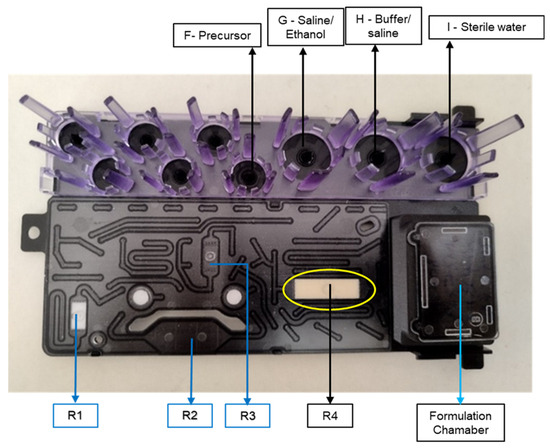 iMiDEV™ is a batch-type microfluidic cassette-based radiosynthesizer that produces radiotracers at room and/or elevated temperatures [23,24,25]. This study used a single-use microfluidic cassette with suitable resins for different radiotracers. A picture of the microfluidic cassette with the vial position utilized in this study is shown in Figure 3. The entire synthesis process, including radiolabeling, solid-phase extraction (SPE) purification, and formulation, was integrated within the microfluidic cassette. All the synthesis steps were performed in auto mode without any manual intervention. A complete overview of the iMiDEVTM supervision software is provided in the Supplementary Material (Figure S3). The iMiDEV™ radiosynthesizer is part of the iMiGiNE™ automated radiopharmaceutical production system.