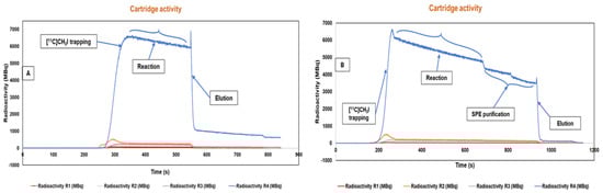 The radiosensor data of the automated complete (A) [11C]MET and (B) [11C]CHL radiosynthesis. Beam time was 5 min (~5.5 GBq of [11C]CH3I) for the both tracers.