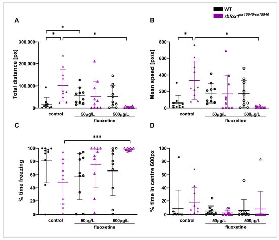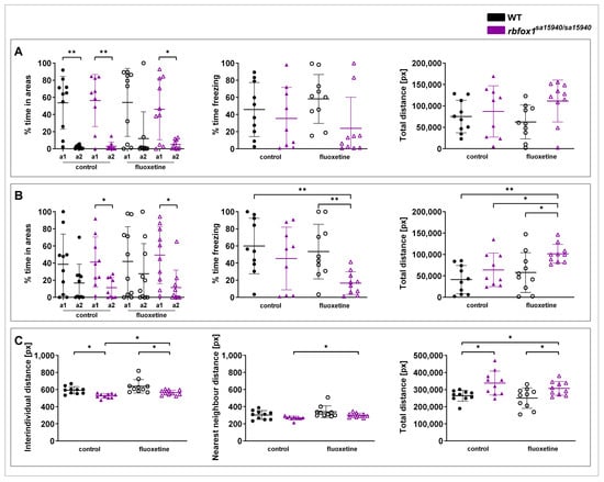 In the VMSP test following Carreño Gutierrez et al. (2019) [39], WT and rbfox1sa15940/sa15940 zebrafish were tested at either 0 µg/L (control) or 500 µg/L fluoxetine. The VMSP arena had five chambers separated by transparent walls, with the central chamber (20 cm × 14 cm, ~10 cm water depth) being flanked by two smaller neighbouring chambers (10 cm × 7 cm each, ~10 cm water depth) on opposite sides (described in Figure 3A,B of Carreño Gutierrez et al. (2019) [39]). Each fish was recorded in two consecutive rounds of testing: In the first round, the social preference step, three unfamiliar zebrafish (strangers 1) were placed in one of the corner chambers. The tested fish was placed in the central chamber and recorded for five minutes. Immediately afterwards, in the social novelty preference step, three more unfamiliar zebrafish (strangers 2) were placed in the corner diagonally opposing the chamber of the first group of fish, and the tested fish was recorded for another five minutes. Total distance, time freezing, time spent in the quadrant close to the group of strangers 1, and time spent in the diagonally opposite quadrant (part 1 of the experiment), which contained the group of strangers 2 in part 2 of the experiment, were analysed. A total of 10 zebrafish were tested between 9:00 h and 18:00 h, except for the rbfox1sa15940/sa15940 control group, where only 9 zebrafish were tested.