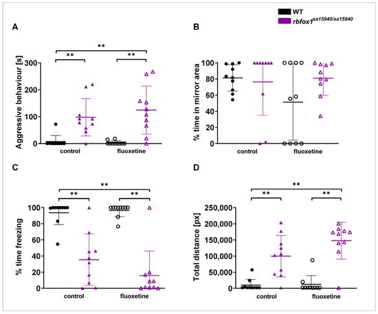 Aggressive behaviour in wildtype and rbfox1sa15940/sa15940 zebrafish after exposure to 500 µg/L fluoxetine. Zebrafish were tested in the Mirror test to assess aggressive behaviour after exposure to water (control group) or to 500 µg/L fluoxetine for one hour prior to testing. (A) Time displaying aggressive behaviour; (B) time spent in 25% of the arena close to the mirror; (C) time spent freezing; (D) total swimming distance; WT = wildtype, rbfox1sa15940/sa15940 = homozygous mutants, control = 0 µg/L fluoxetine, fluoxetine = 500 µg/L fluoxetine; N = 10 per group; permutation two-way ANOVA with interaction followed by post hoc permutational analysis using Benjamini and Hochberg correction; mean ± SD; ** padj < 0.01.