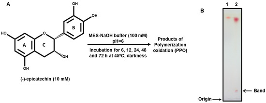 The generation of the products of the polymerization oxidation (PPO) from (-)-epicatechin was carried out through autoxidation (Figure 1A). Initially, the autoxidation of this flavonoid was monitored with thin layer chromatography (TLC) throughout the reaction, at 6, 12, 24, 48, and 72 h. Changes in TLC product mobility were detected at 72 h, and the presence of a band close to the origin of the application was observed (Figure 1B). The autoxidation of (-)-epicatechin under this condition (mildly acidic conditions pH = 6.0) was analyzed with LC-MS.
