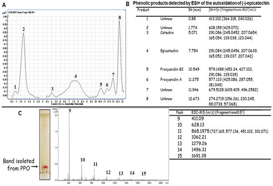 HPLC-ESI-MSn spectra of the autoxidation products of (-)-epicatechin: (A) Base peak chromatogram of the autoxidation of (-)-epicatechin; (B) Products generated through the autoxidation of (-)-epicatechin; catechin [36], procyanidin B2 [31,37], procyanidin A [36] and (C) TLC pattern of the PPO mix and ESI-MS of the possible oligomers (peaks 9–15) obtained through the autoxidation of (-)-epicatechin.
