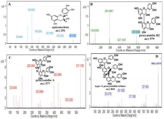 These oligomers are generated through the oxidation of the monomeric units of (+)-catechin and (-)-epicatechin, which are linked by inter-flavonoid carbon–carbon bonds between C-4 and C-8 or C-4 and C-6. Interestingly, it has been described that the difference between natural dimers and dimers generated by oxidation is in the bond position (C6 to C8 or C6 to C6) [30,31]. Furthermore, these procyanidins are considered to be a group of unnatural oligomers, which have the same molecular ion mass spectra (MS1) but different structures when compared to natural isomeric procyanidins.