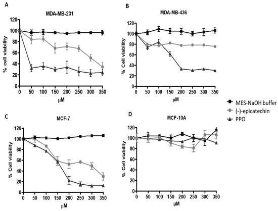 MTT [3-(4,5-dimethylthiazol-2-yl]-2,5-diphenyl tetrazolium bromide] assays were performed to measure the growth of all cell lines (MDA-MB-231, MDA-MB-436, MCF-7, and MCF-10A) in the presence of (-)-epicatechin, the reaction buffer [MES-NaOH (100 mM, pH 6.0)], and the PPO mixture [47].