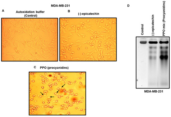 As MDA-MB-231 cells showed a higher sensitivity to PPO, they were selected for subsequent determinations. First, to determine whether the antiproliferative activities observed with (-)-epicatechin and the PPO mix were related to apoptosis, we characterized their effects on cell morphology and DNA fragmentation, which are features of the apoptotic process and do not indicate necrotic activity [41]. Figure 5 shows the morphological changes that were generated after 72 h of treatment with the autoxidation buffer (MES-NaOH), (-)-epicatechin (350 µM), and the PPO mixture (350 µM). The cells that were treated with autoxidation buffer showed a morphology that was characteristic of MDA-MB-231 cells (Figure 5A). However, a spherical morphology was observed in cells treated with (-)-epicatechin (Figure 5B); additionally, PPO treatment resulted in membrane blebs (Figure 4C, arrows). On the other hand, the presence of DNA and its analysis under these conditions demonstrated the presence of DNA fragmentation (Figure 5D)—an event that is characteristic of apoptosis. Importantly, similar results were observed in the other cell lines studied.