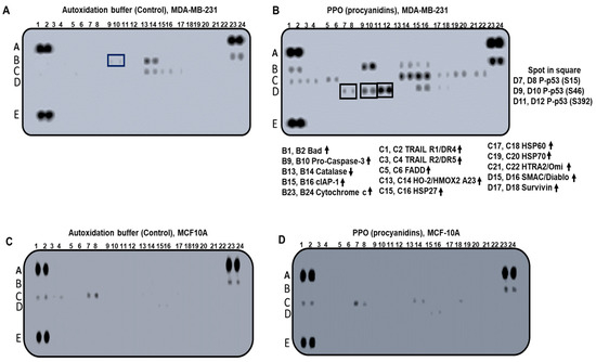 Human apoptosis array analysis in response to (-)-epicatechin and PPO treatment. Whole-cell lysates were prepared from MDA-MB-231 and MCF-10A cell lines and were left either untreated or exposed to MES-NaOH buffer and hybridized to a human apoptosis array kit (A and C, respectively). The MDA-MB-231 (B) and MCF-10A (D) cell lines were treated with PPO (proanthocyanidins) for 72 h. Each protein was spotted in duplicate. The pair of dots in each corner were positive controls. Each pair of protein dots is indicated with its change in expression. At the same time, no obvious change was observed in MCF-10A cells (C,D). Up and down arrows (Increase or decrease in the expression, respectively), the A-E letters on the left side of each membrane are coordinates for the protein identification.