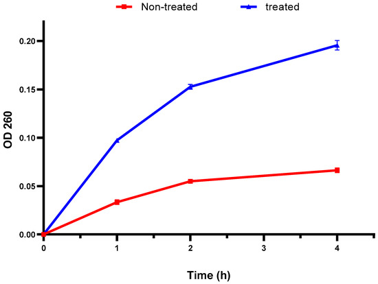 Inner membrane permeability was investigated by tracking the discharge of the β-galactosidase enzyme from the cell by adding ONPG, which is converted by the enzyme to o-nitrophenol (ONP). Then, the absorbance of the formed ONP was measured at 420 nm using an ELISA reader (Sunrise, VA, USA) [79]. The β-galactosidase enzyme under normal conditions is present in the cell interior. When inner membrane integrity is impaired, the enzyme is released from the cell interior to the outside. Upon adding its substrate, ONPG is converted to ONP, which has an absorption at 420 nm.