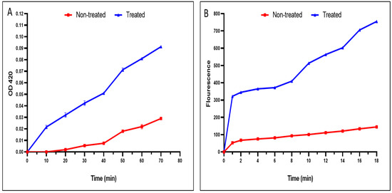 An illustration of the damage caused by the fenugreek extract on the (A) inner and (B) outer membrane permeability. The red line represents the absorbance before treatment, and the blue line represents the absorbance after treatment with the fenugreek extract.