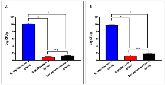 The CFU/mL number in (A) the small intestine and (B) the caecum. (*) symbolizes a significant difference (p < 0.05), and NS denotes a non-significant (p > 0.05) difference.