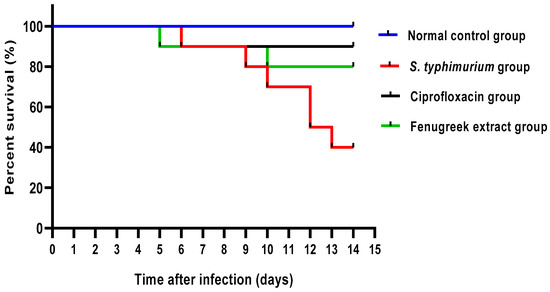 Mice survival curve. All mice were alive till the end of the experiment in the control group. In the S. typhimurium-infected group, one mouse died in the sixth, ninth, tenth, and thirteenth days, and two mice died in the twelfth day. In the ciprofloxacin-treated group, only one mouse died on the sixth day. In the fenugreek-extract-treated group, one mouse died on the fifth and tenth days.