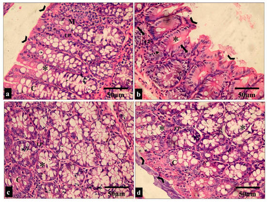 Light microscopic images of the H&E-stained large intestine sections in all the studied groups. (a,c) Groups I and III show normal colonic mucosa, with the surface of the mucosa covered with a striated brush border (arrowheads). The lamina propria (LP) of the mucosa contains simple tubular intestinal glands (crypts of Lieberkühn) (C). The crypts are lined by numerous goblet cells (*). (b) Group II shows loss of surface epithelium (arrowheads) with mononuclear cellular infiltration in the lamina propria of the glandular tissue (arrows). Additionally, there is an apparent reduction in the number of goblet cells (*) and crypt abscess formation (dashed arrow). (d) Group IV shows restoration to the normal histological appearance of the colonic mucosa, with straight intact brush borders (arrowheads) and numerous goblet cells in the glandular tissue (*). (H&E × 400, scale bar = 50 μm).