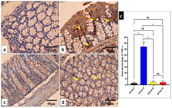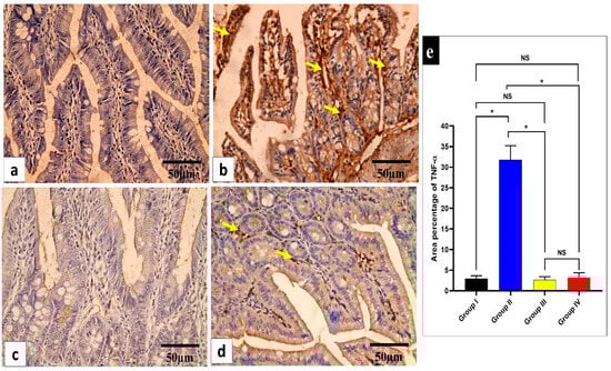 Light microscopic images of TNF-α-stained large intestine sections in the different studied groups. (a) Group I shows a negative TNF-α immune reaction in the surface epithelium and all colonic glandular cells. (b) Group II shows a strong positive TNF-α immune reaction in the form of a brown cytoplasm of the surface epithelial and glandular cells (yellow arrows). (c) Group III exhibits a negative TNF-α immune reaction expression in all mucosal cells. (d) Group IV shows no TNF-α immune reaction in the majority of cells and a weak immune reaction in a few glandular cells (arrows). (e) The area percentage of TNF-α in all groups. Mean ± SD is used to express the data. Statistical comparison was performed using a one-way ANOVA and Tukey’s post hoc test for multiple comparisons. The single asterisk represents a significant change, and the abbreviation NS represents a non-significant change (p < 0.05). (TNF-α immune reaction in cell immunostaining × 400, scale bar = 50 μm).